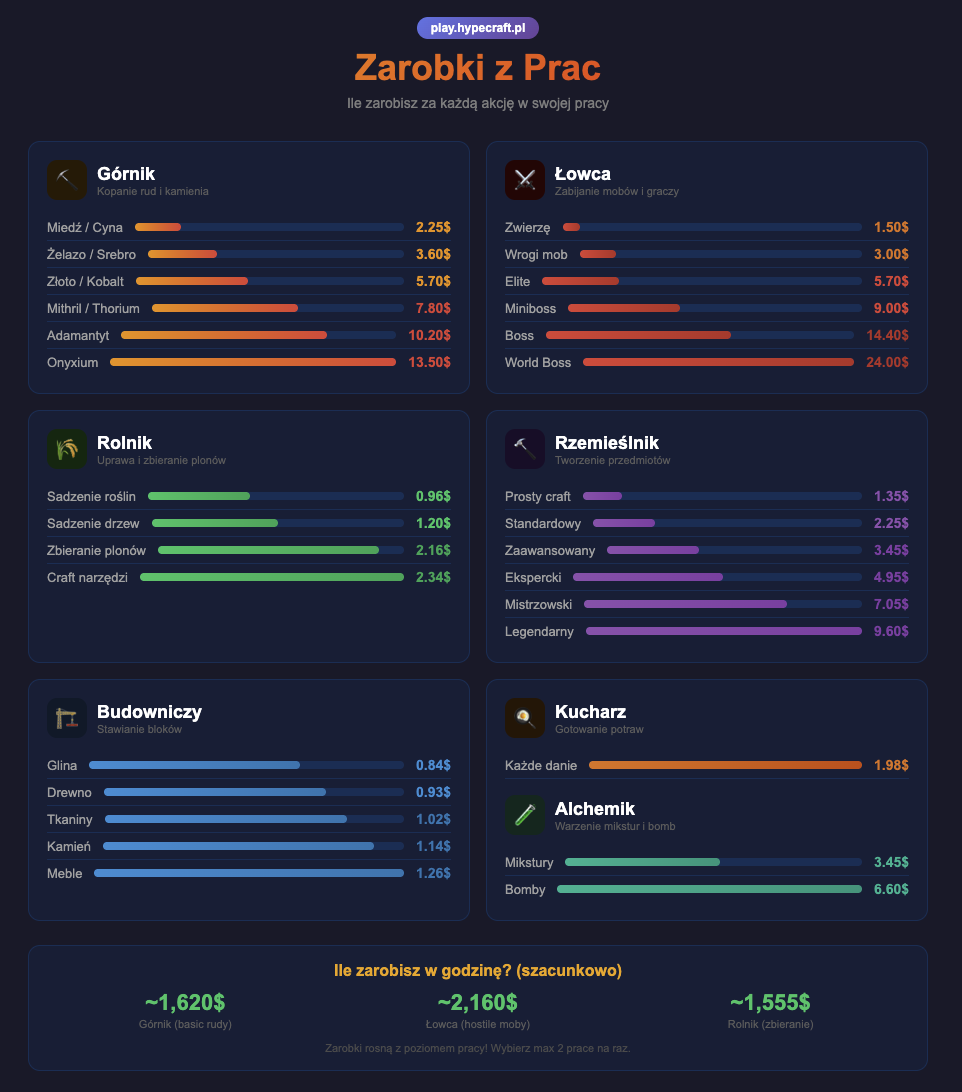 Mamy świetne wiadomości dla wszystkich graczy HypeCraft! Właśnie przeprowadziliśmy znaczącą aktualizację systemu zarobków – stawki za wszystkie prace zostały podwyższone. Niezależnie od tego, czy jesteś górnikiem, łowcą, rolnikiem czy rzemieślnikiem – od teraz zarabiasz więcej. Oto kompletny przegląd nowych stawek.